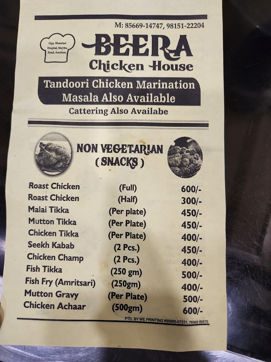 Overall, the offerings reflect a longstanding tradition of flavorful, juicy preparations that have made Beera Chicken House a steady choice amid Amritsar’s vibrant food scene.
